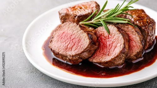 steak, beef, sliced, roasted, sauce, gravy, meat, tenderloin, cooked, rare, red, pink, juicy, tender, savoury, seasoned, rosemary, garlic, plate, dish, food, meal, epicure, eatery, dinner, cooking, delicious, appetising, protein, nourishment, culinary, gastronomy, cookery, mediterranean, european, fine dining, elegant, premium, luxury, exclusive