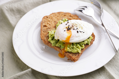 Slices of gluten-free sunflower seeds bread with mashed avocado, poached egg with egg yolk dripping and sesame seeds on white plate on green checkered napkin