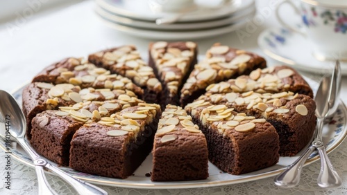 cake, chocolate, almond, slice, dessert, baked, sweet, tea, time, afternoon, serving, plate, fork, spoon, table, setting, food, photo, homemade, bakery, confectionery, snack, treat, delicious, rich, moist, topping, nut, brown, vintage, porcelain, cup, saucer, cut, portion, epicure, receipe, culinary, good, appetising
