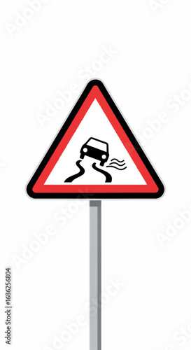 slippery, road, signs, warning, danger, caution, car, vehicle, skid, accident, safety, traffic, driving, weather, wet, ice, snow, hazard, triangle, red, black, white, symbol, icon, alert, automotive, transportation, street, highway, route, journey, travel, risk, precaution, driver, motorist, automobile, graphic, illustration, isolated, background, clear, simple, minimalist, communication, information, guidance, regulation, rule