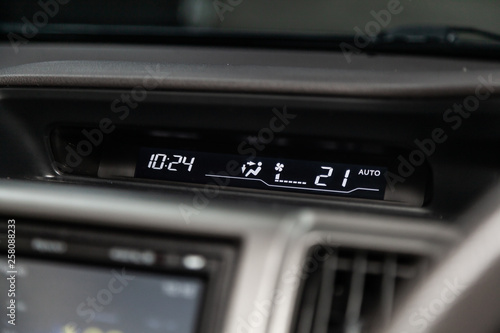 Сlose-up of the car black interior: dashboard with watch, temperature,monitor.