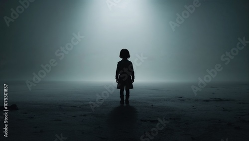 children, small, standing, shadow, light, mist, expression, solitude, emotion, indoor, silhouette, vulnerability, innocence, contemplation, dim, atmosphere, loneliness, quiet, space, dark, stillness, environment, isolation, gazing, thoughtful, young, peaceful, uncertain, dramatic, background, yearning, personal, life events, ambiguity, introspection, growth, exploration, childlike, presence, mystery