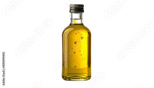 Small, clear glass bottle filled with yellow liquid, dark cap, bubbles visible