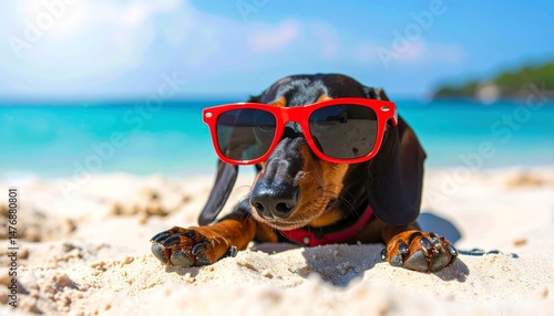 dachshund, dog, beach, summer, sunglasses, sand, tropical, ocean, water, blue water, pet, animal, cute, adorable, funny, happy, relaxed, vacation, travel, holiday, sunshine, bright, daytime, wildlife, mammal, canino, domestic, portrait, animal portrait, summer getaway, beach vacation, tropical beach, relaxing, fun, joyful, playful, sunny, warm, vibrant, colourful, beautiful
