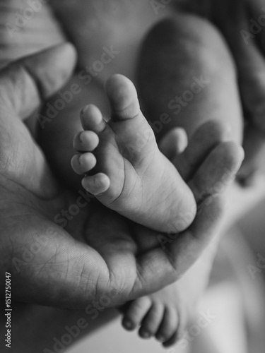 Small feet of a newborn in the hands of a parent: an intimate, black and white portrait
