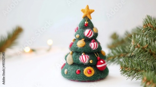 felt, christmas, tree, small, ornament, red, gold, white, star, holiday, festive, decoration, hand-made, craft, winter, cosy, soft, miniature, cute, simple, traditional, seasonal, decor, tabletop, bricolage, warm, wool, decorative, cheerful, green, closeup, background, indoor, whimsical, new, year, 2024, 2025, banner, poster