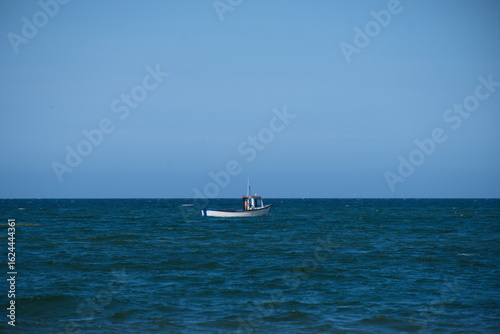 Small fishing boat floating in the ocean alone
