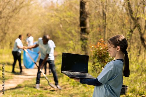 Small girl using isolated display on laptop during litter cleanup session in the woods, taking part in an environmental conservation activity. Little activist protecting the ecosystem and wildlife.