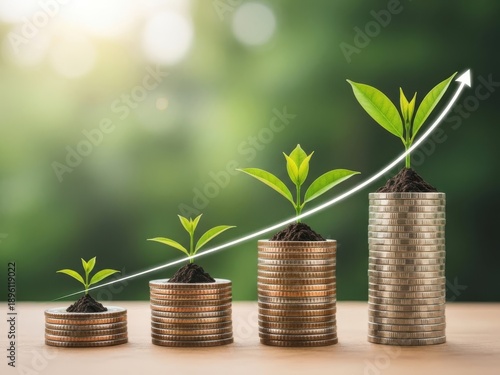 money, growth, finance, investment, savings, coin, copper, plant, leaf, green, dirtied, nature, progress, development, success, wealth, prosperity, business, economic, arrow, increase, concept, minimalist, wooden