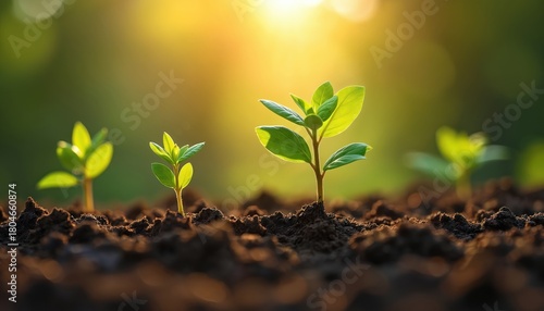 Small green seedlings sprout from dark soil. Tender plants grow toward bright sun light. New life begins as tiny sprouts emerge in fertile ground.