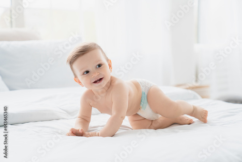 Small little smiling european infant toddler baby boy girl son daughter in diaper crawling on the comfy bed with white linen, first steps, motherhood,dryness and absorbency concept