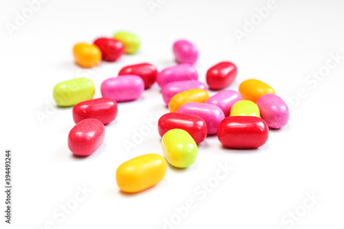 Small pill drops scattered on white surface. Pile of colorful bean shaped candies