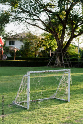 Small soccer field in the park Along with soccer balls and small goals for the children to play in the evening.