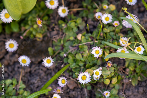 Small white daisy flowers blooming in spring garden.