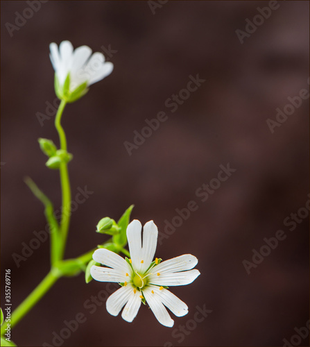 Small white spring flower with double petals on a brown background.