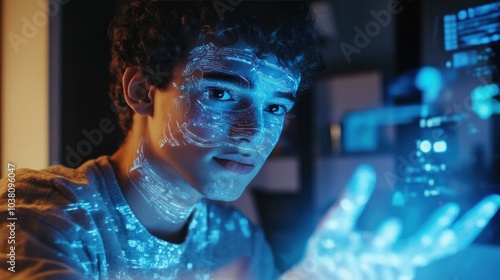 Smart assistant technology on phone: A holographic assistant interacts with a young man, assisting with various tasks