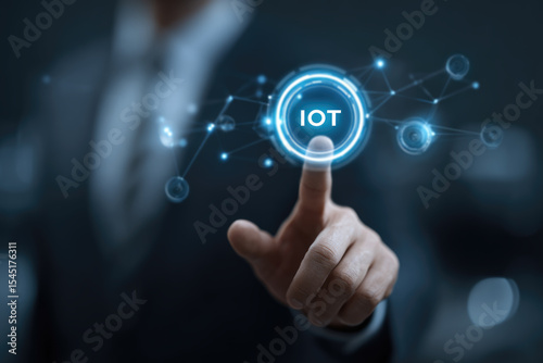 Smart business IOT, internet of things concept. Businessman touching IOT icon on virtual screen, connected internet network to access AI intelligence