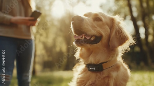 smart, collar, health, monitoring, gold, retriever, dog, pet, technology, outdoors, nature, smartphone, sync, update, care, wellness, contraption, forest, walk, happy, animal, innovation, connected, bluetooth, lifestyle, tracker, high technology, wearable, fluffy, fur, smile, grass, pastoral, veterinary, communication, screen, sensor, app, holistic, sunny