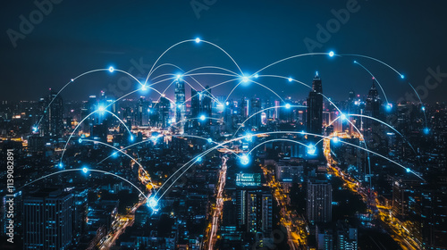Smart digital city with connection cyber security network reciprocity over the cityscape . future smart wireless digital city and social media networking systems that connects people within the city