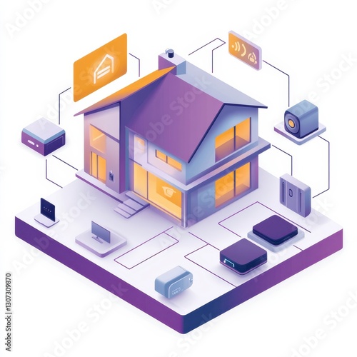 smart, home, isometric, illustration, technology, automation, connected, device, house, cyberspace, of, thing, modern, digital, network, wireless, security, computer, laptop, purple, orange, soft, lighting, system, 2, story, clean, design, minimal, graphic, vector, appliance, electronic, tech