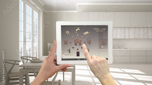 application, house, automated, modern, touching, domotics, finger, innovation, hand, idea, smart, futuristic, technology, appliance, app, artificial intelligence, multimedia, icon, security, interface, home, control, digital, connected, concept, virtual, efficiency, energy, setting, cyberspace, system, tablet, eco, connection, light, online, remote, holding, mobile, controller, intelligence, monitoring, interior, design, kitchen, classic, dining