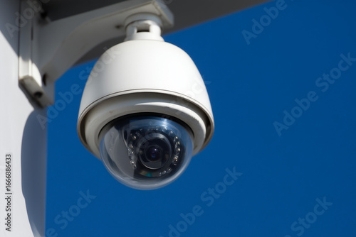 Smart surveillance dome camera facing blue sky background