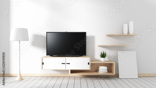 Smart Tv - blank black screen hanging on the cabinet, modern living room with white wood floor. 3d rendering