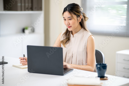 Smart woman office worker holding pen and looking at laptop on white table in office.