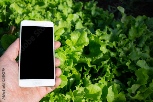 Smartphone in mans hand against the background of beds with lush salad in the garden