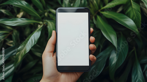 smartphone, blank, screen, hand, isolated, mobile, device, technology, electronic, display, nature, leaf, greenery, foliage, environment, communication, connection, contraption, modern, sleek, digital, presentation, isolation, product, minimalist, clean, white, black