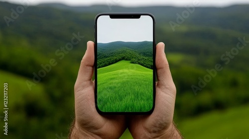 smartphone, landscape, hill, greenery, vegetation, nature, mobile phone, technology, outdoors, image, display, screen, rolling hills, scenic view, picturesque, beautiful, vibrant, lush, hand-held, view, scenic, digital image, photograph, picture, hand, human hand, person, device, digital, mobile device, electronic device, field, grass, pastoral, tranquil, serene, calm, peaceful, relaxing, natural beauty, countryside, environment
