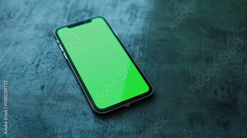 smartphone with blank green screen on textured surface, ideal for mockups and presentations. sleek design and vibrant color make it versatile choice for digital content