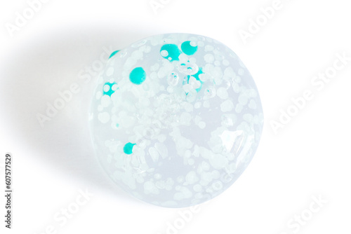 smears and drops of transparent gel with blue granules. On a white background.