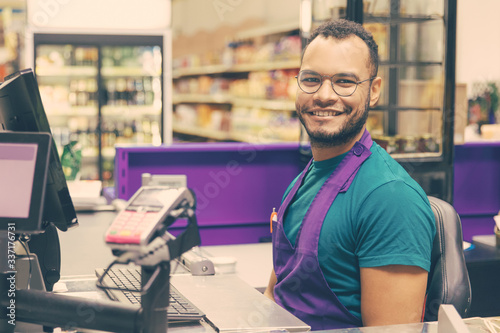Smiling African American cashier sitting at checkout. Cheerful bearded young man in eyeglasses at workplace. Shopping concept