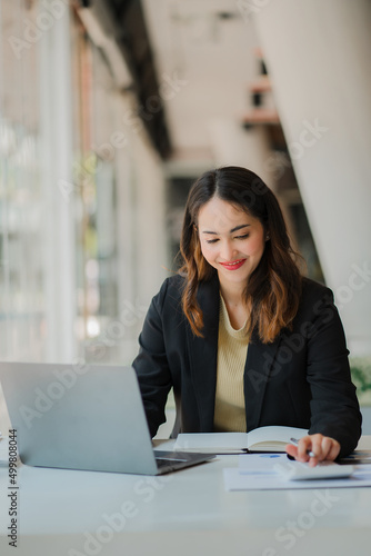 Smiling Asian businesswoman working on paper and holding pen and laptop sitting on a chair at modern home studio. Mobile workers at work and calculators Finance or Accounting Concepts