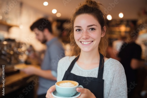 barista, hot drink, smile, latte, art, coffee, bright, welcoming, vibrant, friendly, espresso, cup, service, positive, warm, cheerful, cosy, lifestyle, modern, drink, hospitality, counter, hand-made, morning, foam, energetic, happy, shop, client, presentation, casual attire, open, daylight, sunlight, interior, mood, confident, local, creative, young, people, bar, community, business, comfort, artisan, daily