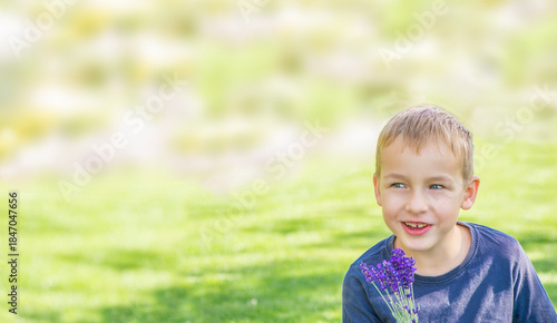 smiling boy resting on lawn and sniffing lavender, free space