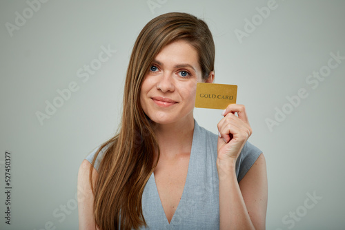 Smiling business woman with credit card isolated portrait.