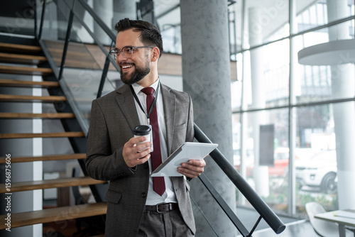 businessman, office, stair, tablet, hot drink, suit, attaching, walking, smiling, modern, building, corporate, business, work, technology, communication, success, professional, career, achievement, executive, manager, entrepreneur, leadership, finance, marketing, sale, strategy, planning, growth, development, innovation, vision