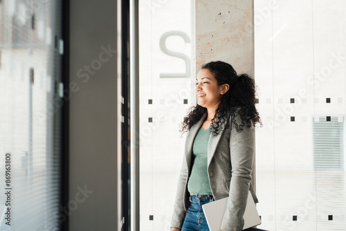 smiling, businesswoman, standing, laptop, leaning, pillar, office, happiness, technology, 1, people, computer, communication, adult, business, woman, day, portable, device, wireless, cyberspace, connection, looking, young, casual attire, occupation, job, corporate, white, collar, men at work, service, mid, happy, holding, window, black, hair, curly hair, coiffure, blazer, jacket, column, female