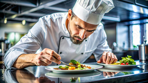 Smiling chef skillfully prepares gourmet salad in restaurant kitchen