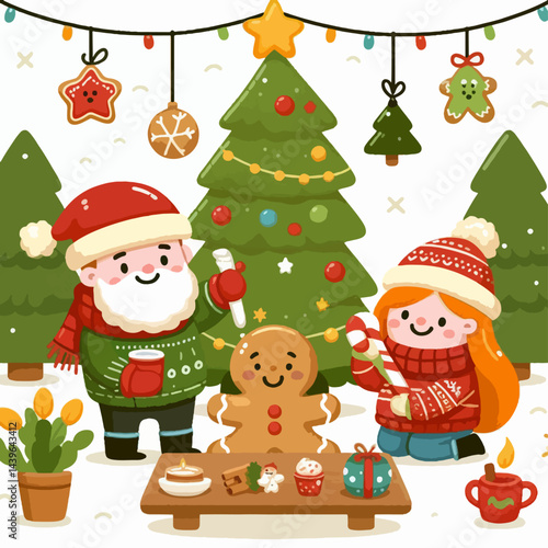 christmas, winter, decoration, holiday, celebration, tree, ornament, gingerbread, cookie, present, warm, cosy, family, people, children, adult, scene, illustration, cute, cartoon, decorating, festive, sweet, happy, smiling, togetherness, love, tradition, delightful, joyful, cheerful, adorable, sweet, winterly, bright