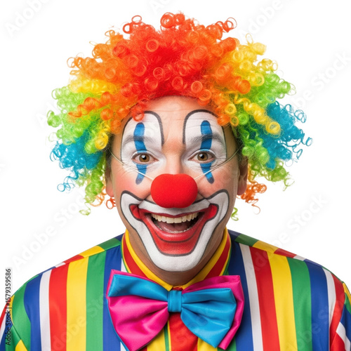 Smiling clown with colorful wig and makeup isolated on transparent background