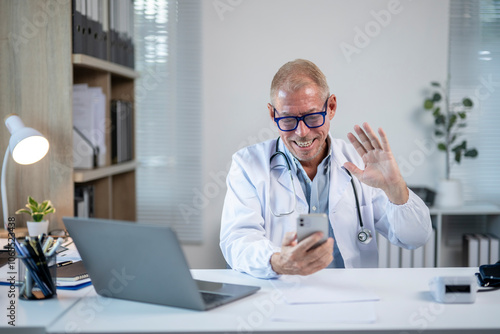 doctor, video, call, waving, phone, office, health care, medicals, technology, online, consultation, medicine, hospital, clinic, appointment, patient, communication, remote, senior, happy, smiling, desk, laptop, stethoscope, professional, health, care, computer, work, workplace, cyberspace, webcam, conference, modern, mature, man, portrait, business, indoor, 1, person, day, copy, space, caucasian, adult