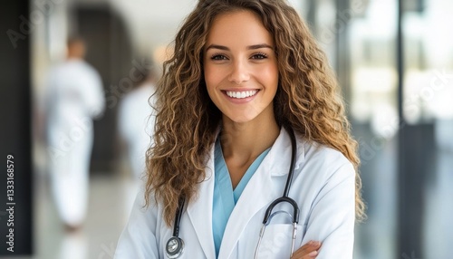 Smiling female doctor in a white coat with a stethoscope in a hospital hallway.
