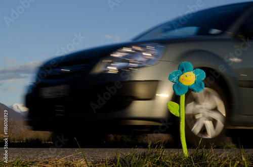 smile, flower, textile, car, traffic, clean, air, road, street, nature, environment, issue, beauty, transport, transportation, simplicity, global warming, future, concept, idea, inspiration, surface, level, sunny, day, no people, outdoors, motion, blur, sunlight, light, modern, grass, mountain, colours, blue, sky, cloud, positive, happy, travel, vehicle