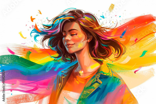 Smiling girl with rainbow flag on background