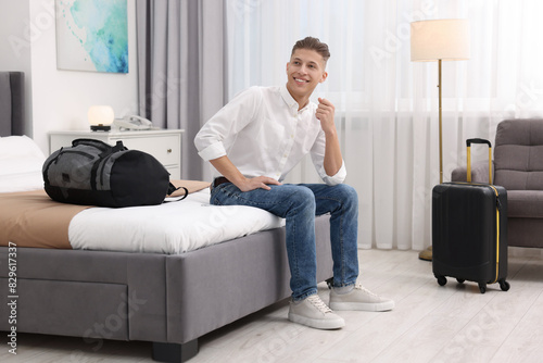 accommodation, adult, apartment, arrival, background, baggage, bed, bedchamber, booking, caucasian, client, comfortable, contemporary, cosy, full, guest, happy, holiday, home, hotel, house, indoor, interior, leisure, length, lifestyle, baggage, luxury, male, man, person, portrait, relax, relaxing, residential, resort, room, service, smiling, style, stylish, suitcase, tour tourism, holiday maker, travel, traveler, traveler, trip, vacation