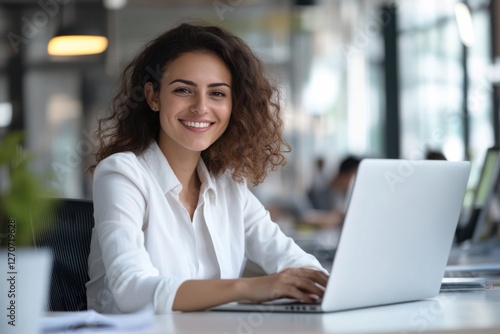 Smiling Hispanic businesswoman working on a laptop in a modern office. Confident young professional, executive, or manager focused on productivity and career success