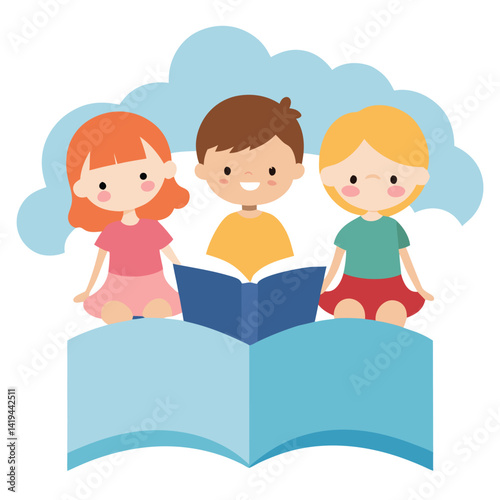Smiling Kids Reading Together On Blue Open Book Under Clouds Cartoon